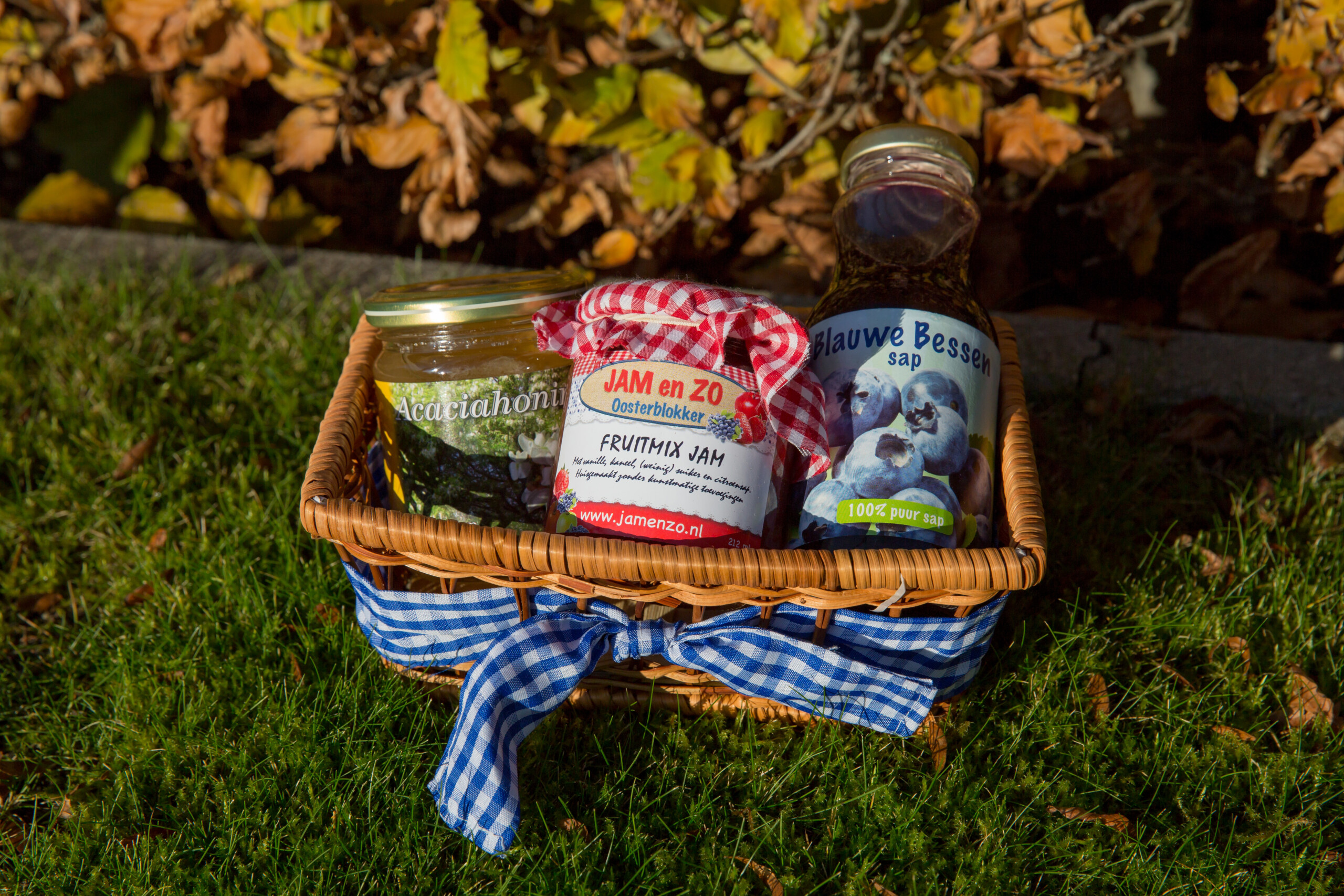 Inhoud mandje 4: Acacia honing, fruitmix jam en blauwe bessensap.
