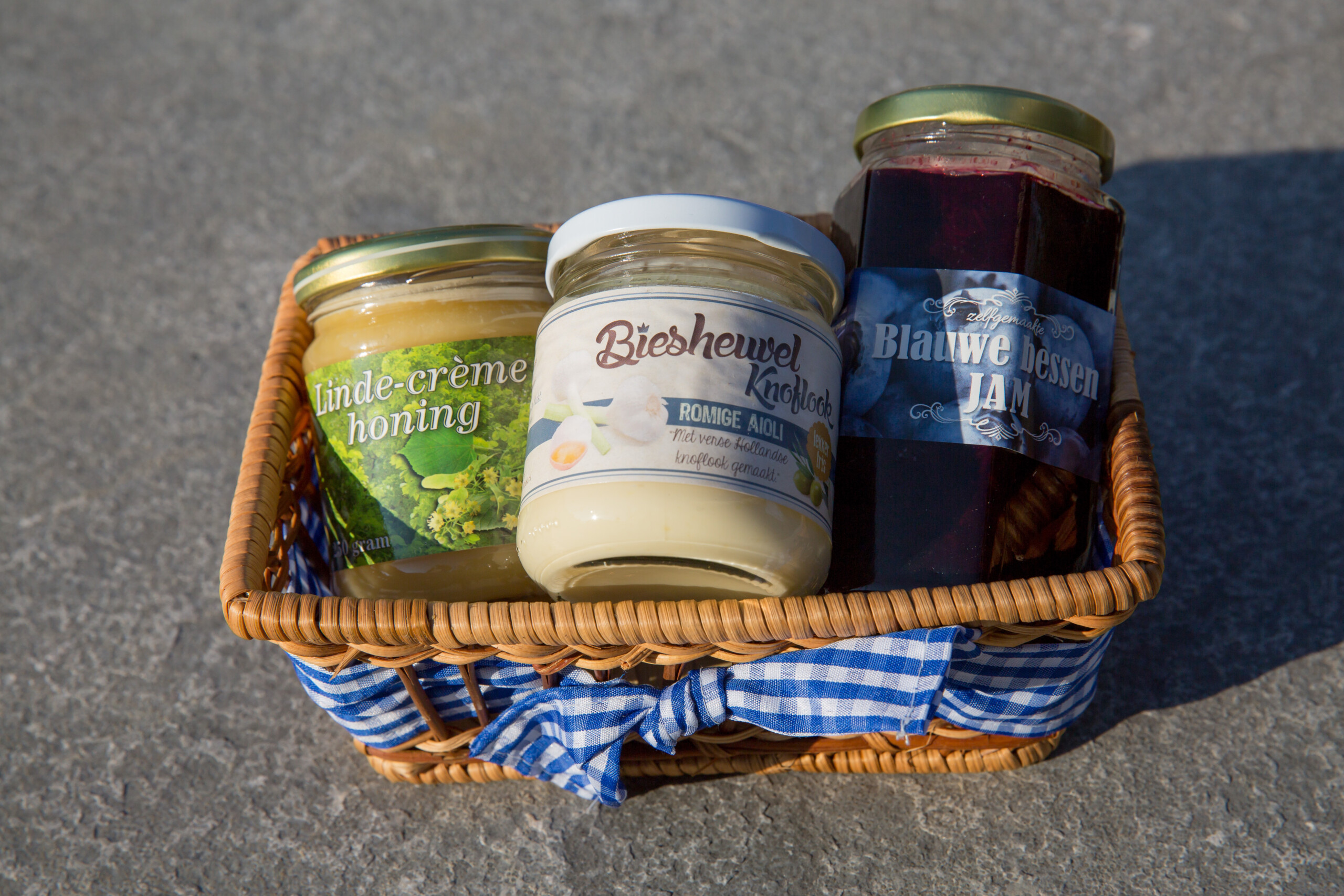 Inhoud mandje 6: Linde honing, romige aioli en blauwe bessenjam.