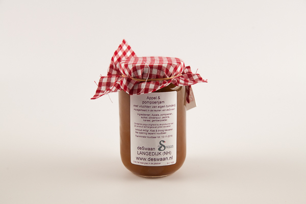 Ambachtelijk gemaakte jam zonder kunstmatige toevoegingen van De Swaan uit Langedijk. Met een minimum aan suiker. Van eigen geteeld fruit zonder bestrijdingsmiddelen. Inhoud: pompoenen, appels, suiker, citroenzuur, pectine, kaneelpoeder & gemberpoeder.